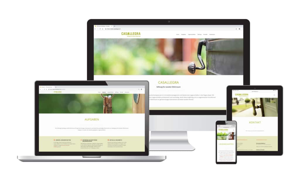 Die neue, elegante Webseite strahlt viel Ruhe aus. Das starke Bildkonzept visualisiert offen Türen, was sich auch im Namen Casallegra widerspiegelt: «Casa» (Haus) und der rätoromanische Gruss «Allegra» (freue dich) stehen für offene Häuser, die ihre Bewohnerinnen und Bewohner willkommen heissen.